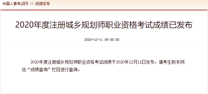 2020年度注册城乡规划师职业资格考试成绩于2020年12月11日发布。请考生到本网站“成绩查询”栏目进行查询。